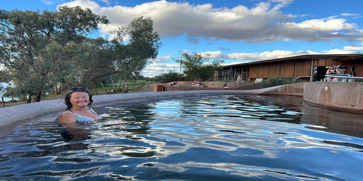 Our time in Cunnamulla was very relaxing too. We viewed the main attractions and walked the town’s streets. But the main attraction is the Artesian Spa, overlooking the Warrego River. The place is fabulous, with a range of outdoor bathing pools of different temperatures (about 33 – 41ºC, a very bracing plunge pool (8-9ºC), steam and sauna rooms and, a relaxation room with lounges, massage chairs, herbal tea and calming mood music. We spent several sessions there across two days, chatting to other travellers and locals while warming our cores. An added bonus is that after 4pm you can BYO, which made watching the sun set so much more convivial. We dined with one couple (Cheryl and Andy from Tasmania) at a local pub, sharing family stories, eating way too much (the portions are huge) and sipping red wine.